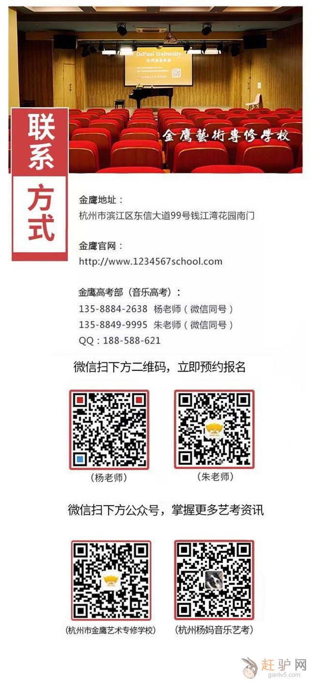 (三)环境条件优越。金鹰艺术专修学校(杭州杨妈艺术培训)地处浙江省杭州市滨江浦沿东信大道99号钱江湾花园南门外,独栋教学楼占地约6000多平米,教学设施齐全,比如钢琴就有86架,能同时满足百余名艺考生日常学习和练琴的需求赶驴网。